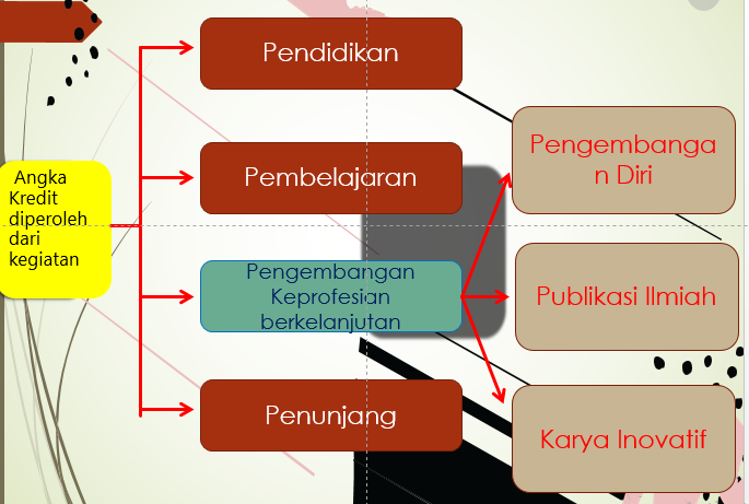 Guru merupakan pejabat fungsional yang pengembangan karir kenaikan pangkat dihitung dari angka kredit yang diperoleh dari pelaksanaan tugas yang dilaksanakan, komponen angka kredit untuk kenaikan pangkat terdiri dari :