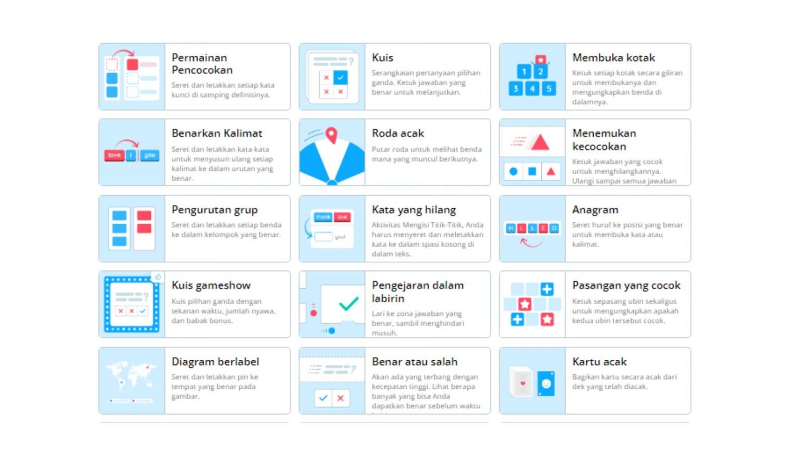 Yang bikin beda dari aplikasi sebelumnya, WordWall punya 18 template seru yang bisa diakses gratis! Wah, lengkap banget ya Bapak/Ibu!
